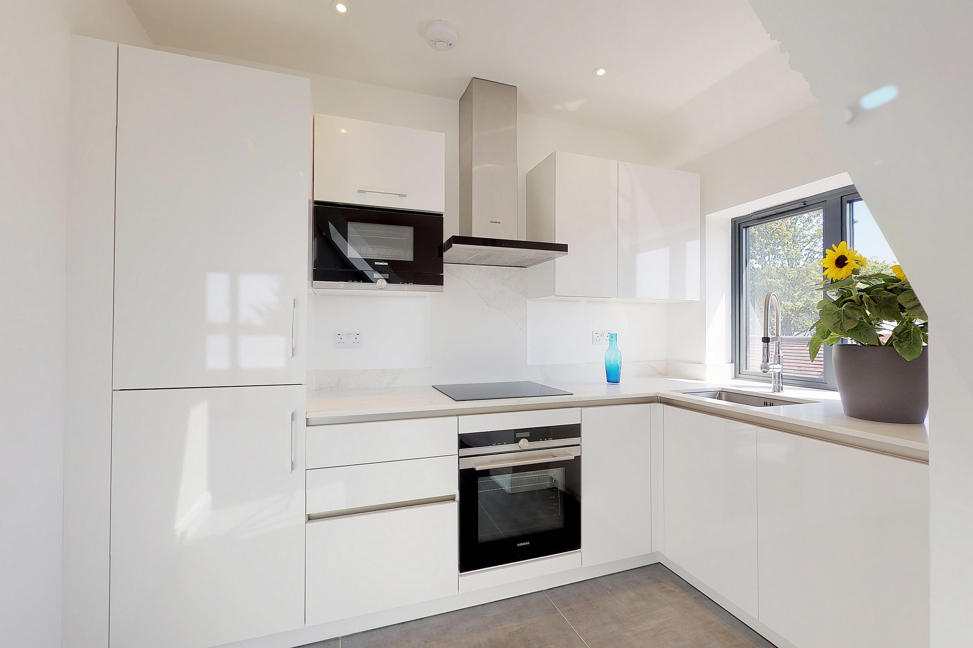 Accommodation comprises a good size primary bedroom with contemporary ensuite bathroom, second double bedroom, family bathroom, through reception with balcony leading to a reccessed open plan kitchen, and a separate utility room.