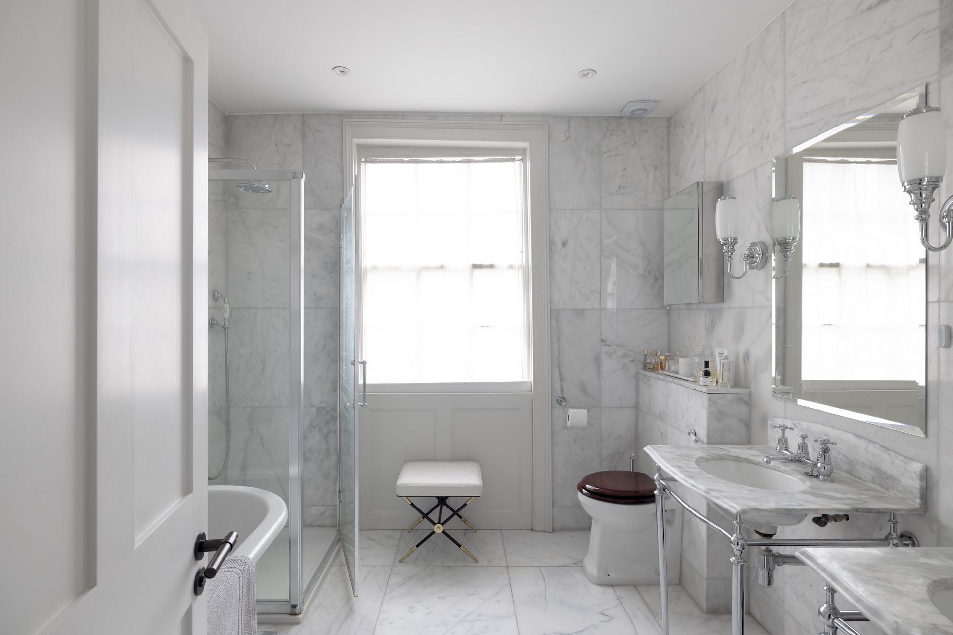 South-facing and flooded with natural light, the property benefits from high ceilings, marble fireplaces, bespoke joinery, wooden flooring and underfloor heating throughout.