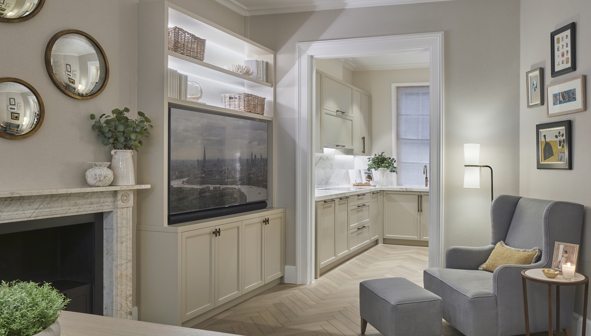A discreet television rises electronically from bespoke cabinetry in the living room, maintaining clean architectural lines when not in use.